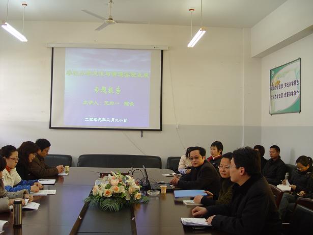 2009年2月20日下午2:00时,管理学院在N4-312会议室召开了第一次全体教职工教研活动。会议由院党委书记张弢博士主持。院长王为一教授作了《用学校的办学思路指导管理学院的办学发展》的主题发言。