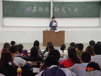2009年8月29日下午2:30,我院09级迎新动员大会在北区4#JT04教室举行。院党委副书记朱艳阳博士、学工办主任王超、年级主任张维功、黄灵辉 、辅导员张刚、刘蓓蓓老师与全体团委学生会成员及08级各班班长参加了本次动员大会。