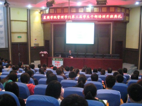 (管理学院 通讯员 杨红梅 王磊 刘浩)2011年11月3日晚6:30,管理学院第三届干部培训开班典礼在行政楼报告厅隆重举行。此次干部培训由管院学生联合会·人力资源部主办。大会特别邀请管理学院党委书记徐超教授作为主讲人出席。学工办主任王超老师、辅导员黄璞也出席了大会。管院全体学生干部到场学习。