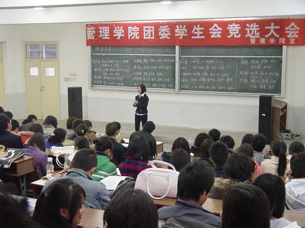 2009年2月23日5点,在北区4号楼JT04,管理学院第一届团委学生会竞选大会顺利召开。党委副书记朱艳阳博士和辅导员老师,上一届的全体学生会干部和各班的班长以及普通学生代表出席大会。