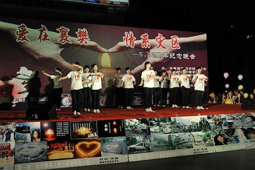 晚会由三个篇章组成:缅怀、青春和展望,基调由沉重逐渐变得充满希望。晚会开始后,罗华国处长发表了讲话,他指出,举办晚会是为了向遇难者致哀,并且希望我校学子弘扬自强不息、越挫越勇的精神,贡献自己的一份力量。乐器演奏的歌曲《直到永远》一下子将活跃的现场气氛变得沉重,伴随着手语《爱与希望》音乐的开始,12个身着印着“I love china”衣服,手捧蜡烛的女孩开始熟练地表演手语。歌曲联唱《天亮了》、《让世界充满爱》、《相亲相爱一家人》以及话剧《生日》诠释了对遇难者的缅怀。节奏强劲的搏击操《中国功夫》一下子让现场火热起来,之后的歌曲和舞蹈表达了人们对于未来的希望。晚会结束时,512个气球一齐放出,为遇难者祈福。一个半小时的精彩表演之后,活动圆满结束。晚会进行的同时,市红十字会设置了捐款箱,在场市民和我校学生纷纷奉献自己的爱心,募集现金1872.20元。据估计,活动现场有上千名观众观看晚会。
