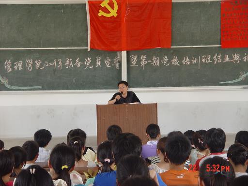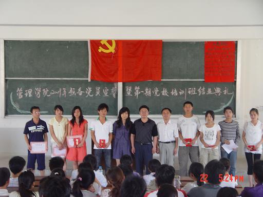 2009年6月22日下午5点,我院2009年预备党员宣誓暨第一期党校培训班结业典礼在4#JT04教室隆重举行。我院59名预备党员和95名入党积极分子参加了此次结业典礼,我院党委书记、党校校长张弢博士,党委副书记、党校副校长朱艳阳博士,党校办公室主任张维功老师出席了此次结业典礼。