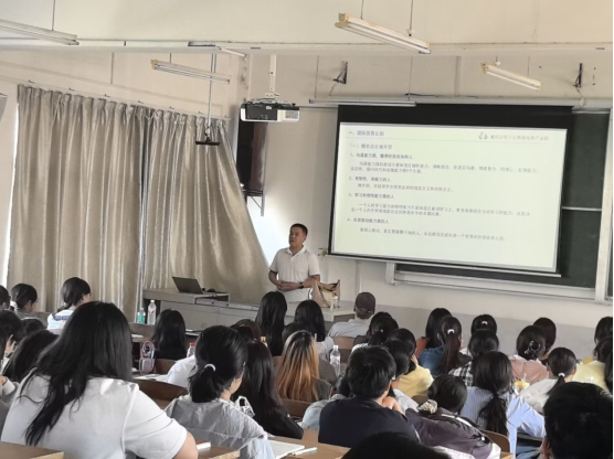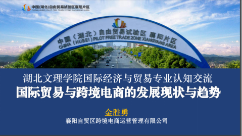 金总首先以个人成长经历娓娓引出主题,从行业、企业视角向新生们介绍了国际贸易与跨境电商的基础认知以及襄阳外贸与跨境电商发展现状。他讲到襄阳自贸区的快速发展,强调襄阳不缺产品(本地有新能源汽车产业链、医药化工、纺织品、农产品等),只缺人才。同学们听得兴趣盎然。随后,金总介绍了外贸与跨境电商的发展趋势,比如智能化、绿色化,跨境电商与产业带融合显著,跨境电商企业向独立站发展以获取更多私域流量和数据等。最后,他强调了襄阳自贸区对大学生创业的支持政策,欢迎大学生朋友到园区大胆创业。