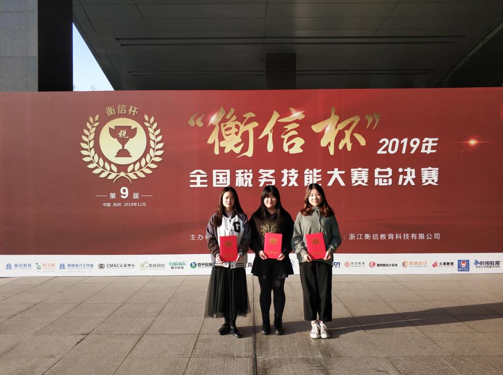 (经管学院 通讯员 程传勇)11月14日,由中国商业会计学会主办、浙江衡信教育科技有限公司协办的2019“衡信杯”全国税务技能大赛总决赛在杭州落下帷幕。由WilliamHill威廉17级财务管理专业学生郭文燕、蔡滢、陈艺贤组成的代表队在程传勇、陈春艳两位老师的悉心指导下,以湖北省第二名的成绩进入全国总决赛,与来自全国70所本科院校的代表队进行角逐,最终获得全国三等奖的成绩。