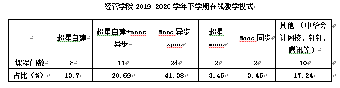 由于现有的在线教学平台多样,课程建设基础不同,课程负责人按照课程标准和要求,充分利用互联网优质教学资源,结合专业特色,因地制宜选择多样化的在线教学模式。经统计,以中国大学mooc异步spoc为主,占比41.4%,超星自建+mooc异步为辅,占比20.69%。具体见下表: