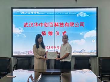 武汉华中创百科技有限公司总经理曹武介绍了公司的发展历程和业务开展情况。他表示创百科技能够为国家的教育事业尽一份绵薄之力,是企业应尽之责。希望通过此次捐赠,为学校事业的高质量发展、为更多湖文学子成长成才助一臂之力。