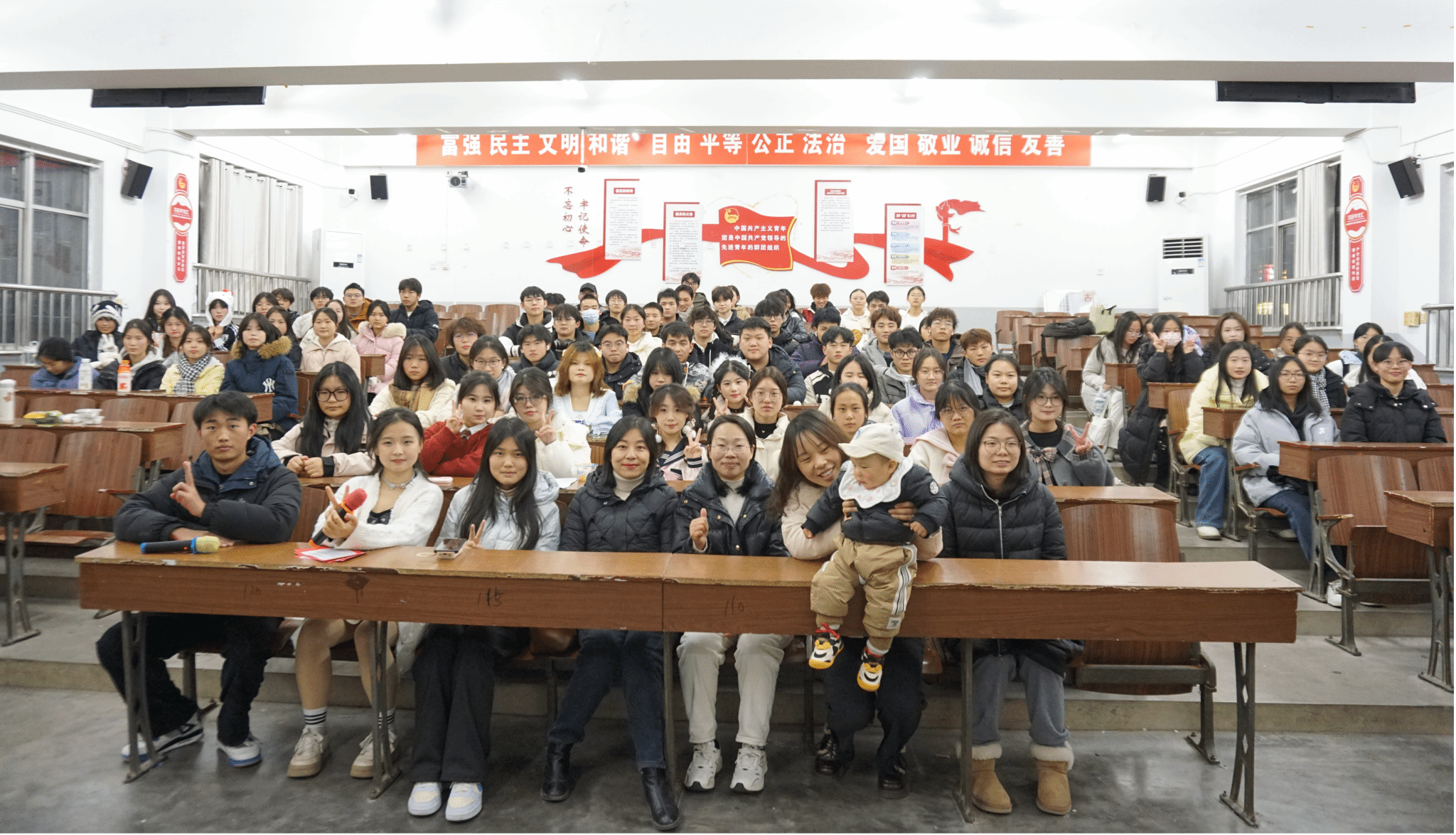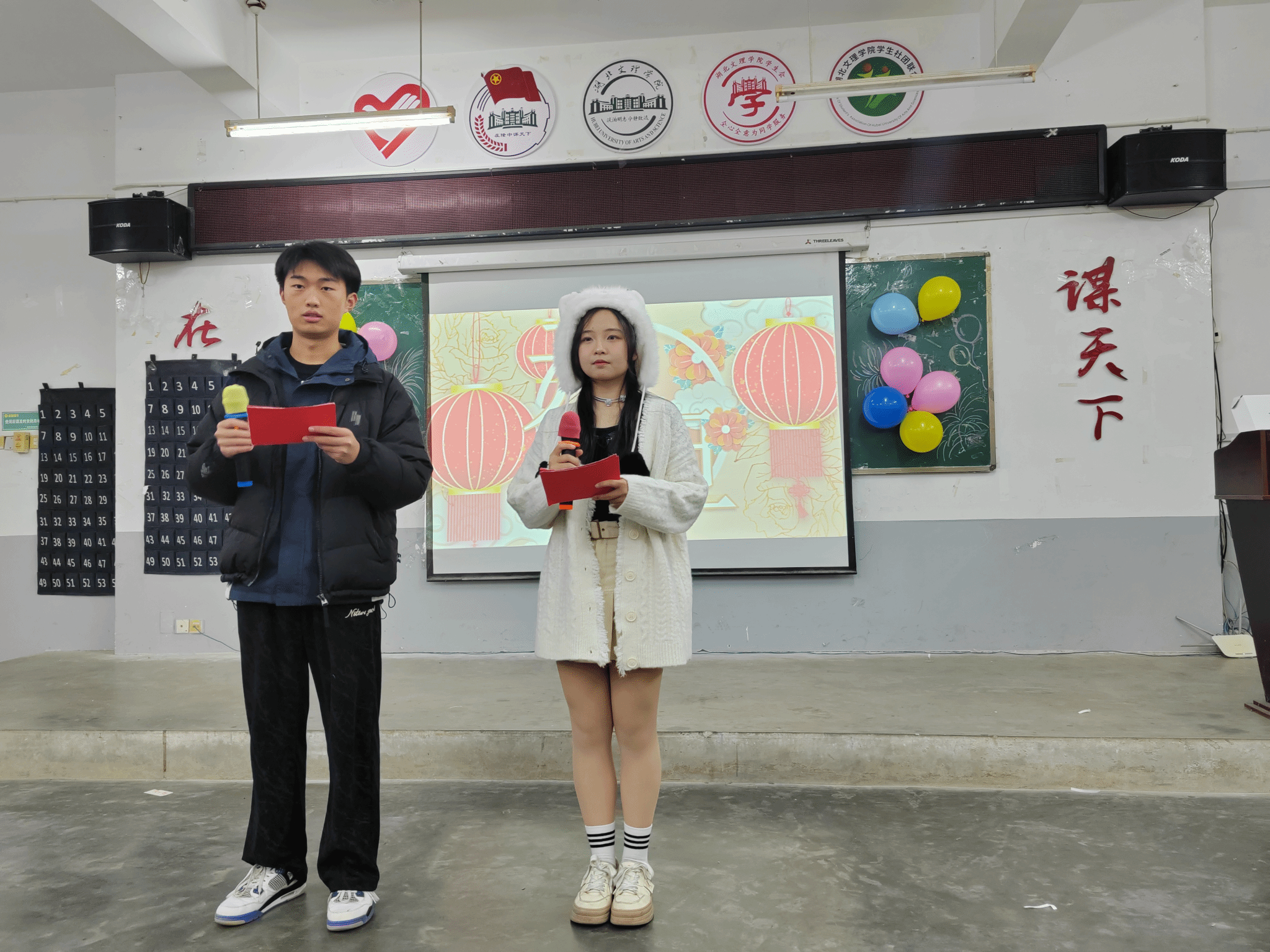 本次活动由同学们自己组织、自己设计、自己编排实施。当日17:00,参与策划的同学们便已提前抵达会场,怀揣着对晚会的热忱与期待,精心布置现场。晚会开始,两个班的班主任发表了热情洋溢的新年贺词,对全体师生表达了衷心的新年祝福。晚会节目精彩纷呈、形式多样。歌曲节目中,歌手们在舞台上用美妙的歌声传递着对新年的祝福与期待;舞蹈节目更是惊艳全场,赢得台下观众的阵阵喝彩。而游戏环节更是将晚会气氛推向高潮,“逛三园”、“知人知面不知心”等互动游戏吸引了众多师生踊跃参与。时光悄然流逝,晚会逐渐接近尾声,全体师生有序汇聚,在镜头前留下了一张温馨满满的集体合照,将这一美好瞬间永久定格。
