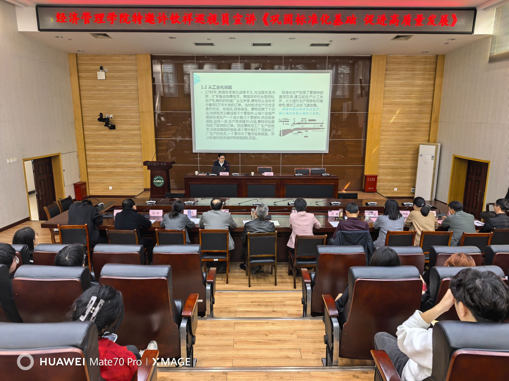 讲座围绕“标准化在经济管理中的战略作用”展开,许钦祥巡视员系统阐述了标准化的基本概念、发展脉络、原理方法,及其在推动经济高质量发展中的多纬应用。他指出,标准是经济活动和社会发展的技术支撑,更是国家基础性制度的重要组成部分。标准化通过统一规则、简化流程、协调系统、优化结构,既提升了生产效率和产品质量,也显著降低了交易成本,增强了产业链供应链的韧性与安全性。同时,他鼓励师生主动学习标准化知识,掌握标准化方法,在未来科研、就业与创业中抢占规则制高点。互动环节,许钦祥与在场师生就“标准与创新协同关系”“高校如何开展标准化教育”等问题进行了深入交流,现场氛围热烈。
